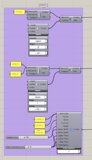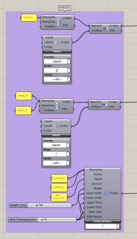 二つができたらそれを CrossSectionMatcher コンポーネントにつなぐことで、名前の通り対象とする要素に、断面が与えられます。ここでは条件は指定していないので、もっとも小さい断面 BCP400x12 が与えられていると思います。 梁に対しても同様に行っています。