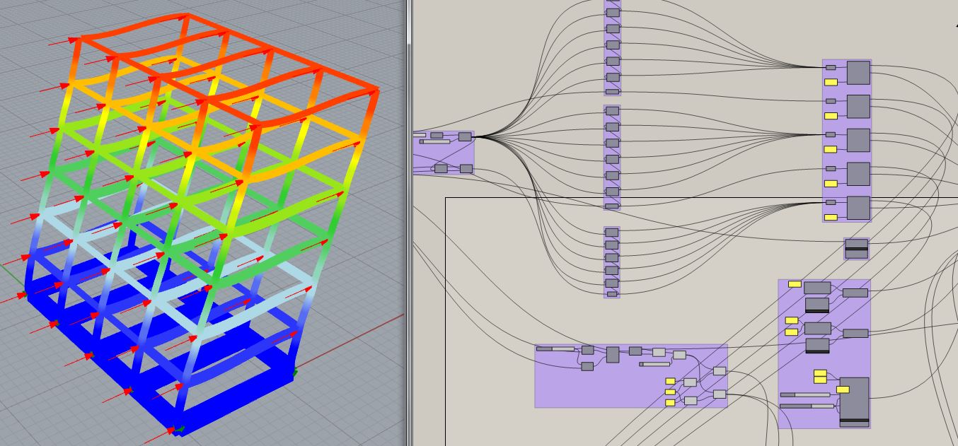 結果は 112.7kg/m2  となっていますので、少しすくない感じがありますが、基本計画であること、解析の NumberSlider コンポーネントを動かせばいくらでも変わることがから、それなりの鉄骨架構の検討が karamba でもできるということが分かったということでいいのではないでしょうか。