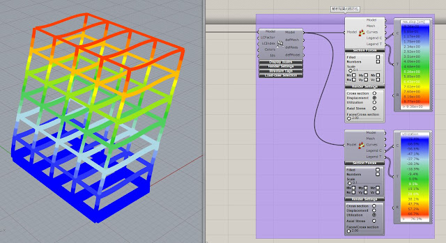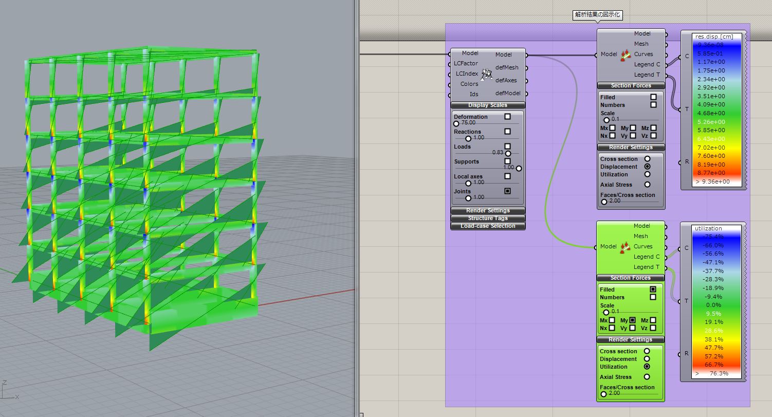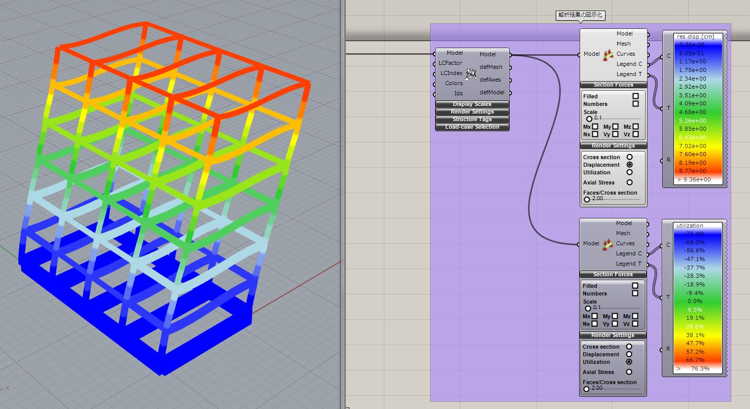 Grasshopper 上の右上のコンターが変位、右下が utilization 分布になっています。最大変位は 9.36cm なので設定した変位のクライテリアの 12cm を下回っていますが、utilization は 76.3%となっており、設定の値を超えてしまっているため、どこか設定が間違っているのかもしれません。