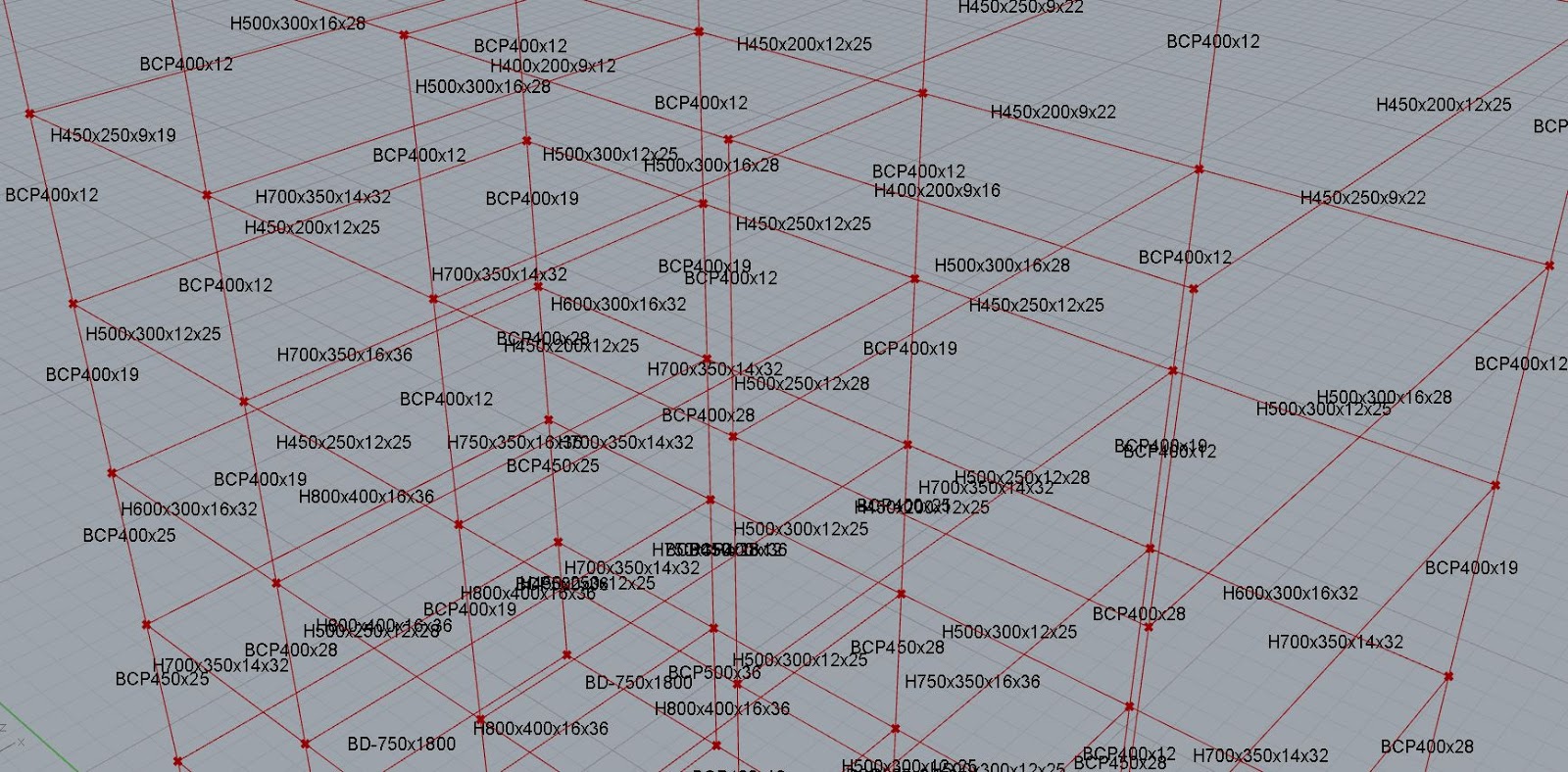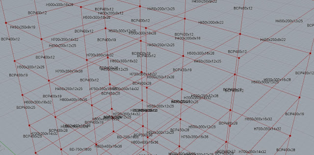 結果で出ていた断面は以下のようになります。最適化は行われているようで、階や箇所ごとに断面が異なるようになっています。単純に応力や変位で決めているだけなので、柱梁の仕口は考えたものにするためにはより細かい設定が必要になります。