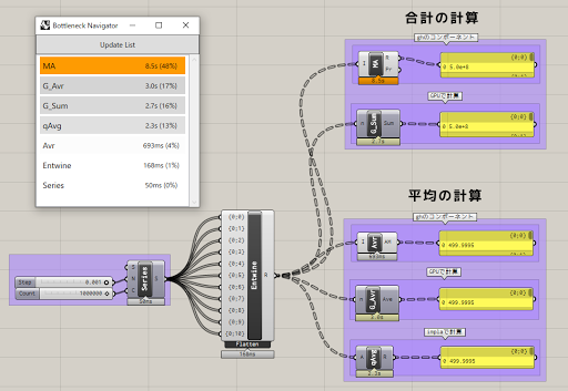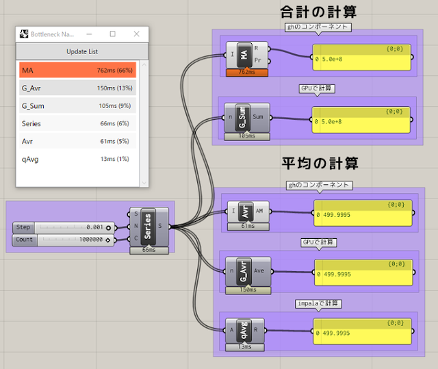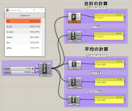 これで動くようになったので、Grasshopper を起動して作成したコンポーネントを使用して比較してみると以下のようになりました。比較としては、合計は、GH の MassAddition コンポーネントとの比較、平均は GH の Average コンポーネントと Impala の QuickAvr コンポーネントとの比較を行っています。