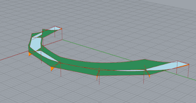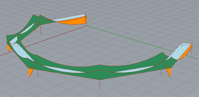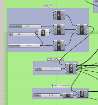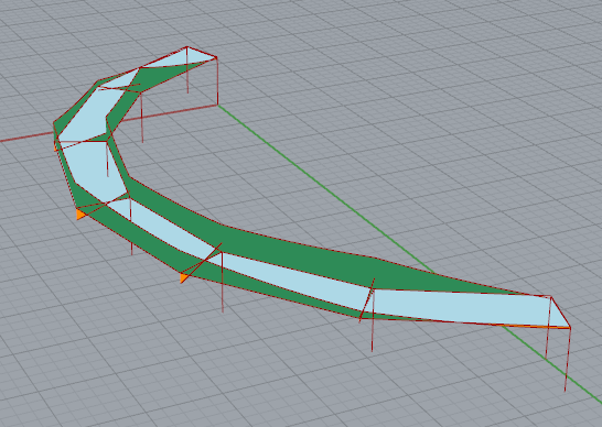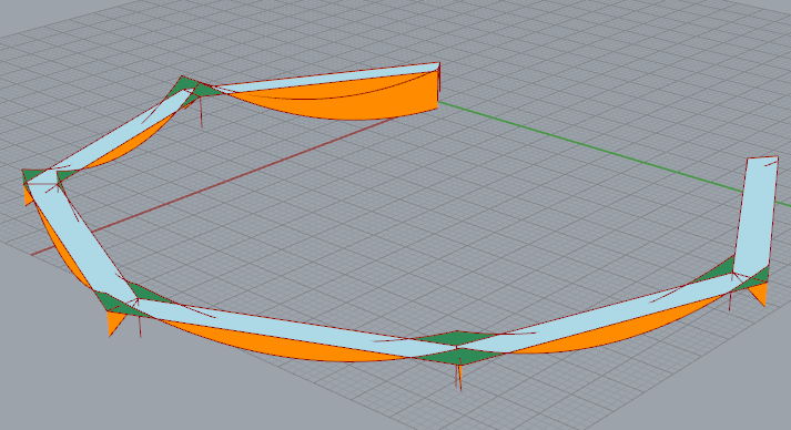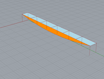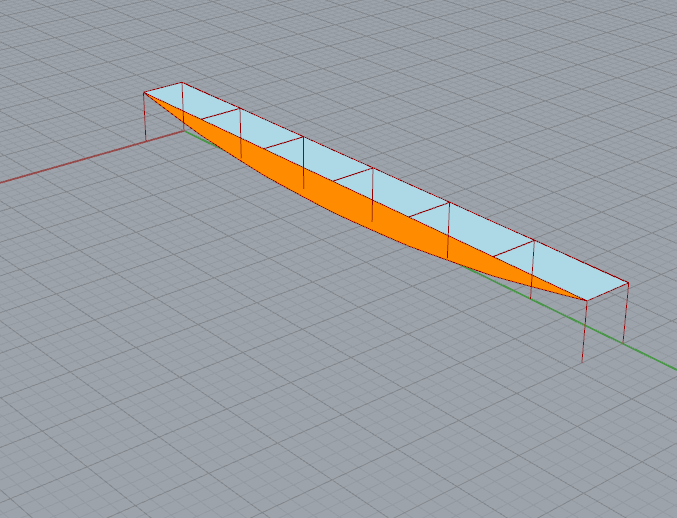 初めにモデル化です。円弧を作成し、柱の本数分だけ分割します。分割した点を屋根の高さにコピーし、この二点をつなげることで柱となるラインを作成します。
