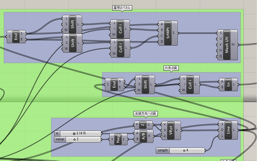 柱頭をつなぐ円弧状の梁は、ShiftList コンポーネントを使って隣り合うポイント間をつなぐことで作成します。屋根を支える片持ち梁は、DivideCurve コンポーネントから出力される接線方向のベクトルを 90 度回転させることで法線方向のベクトルを取得して作成します。