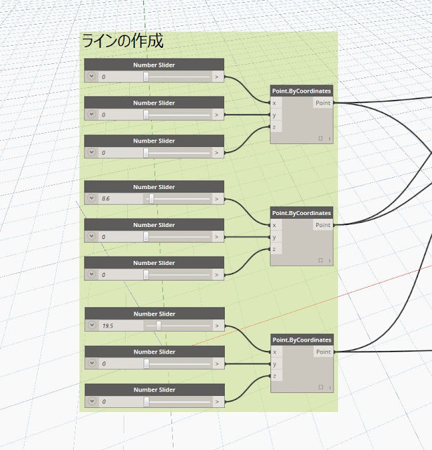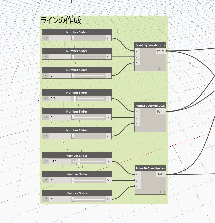 インストールが完了したら、モデル化を行います。今回は単純梁の解析を目的にしているので、ラインの作成を行います。number slider と Point.ByCoordinates を使用してポイントを作成します。インターフェースの違いや操作法、名称の違いはあるものの、おおよそ grasshopper と同じような形でラインは作成できます。
