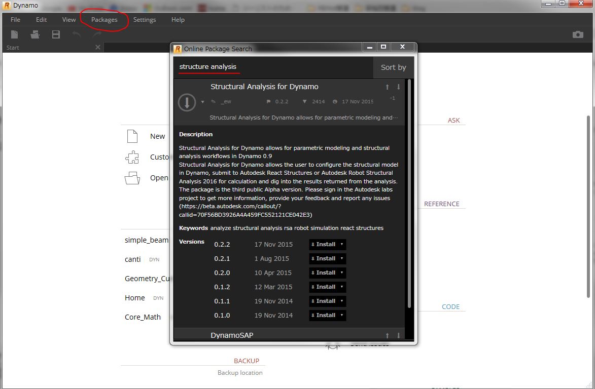 まずは、Dynamo に ReactStructures と連携するためにパッケージをインストールします。Dynamo の Packages から Search for a Package を選択し、「Structural Analysis for Dynamo」を検索しインストールします。