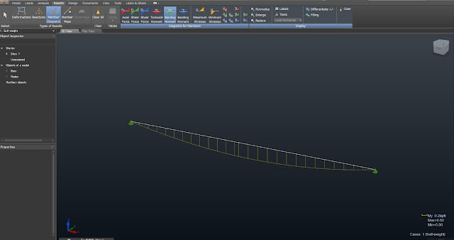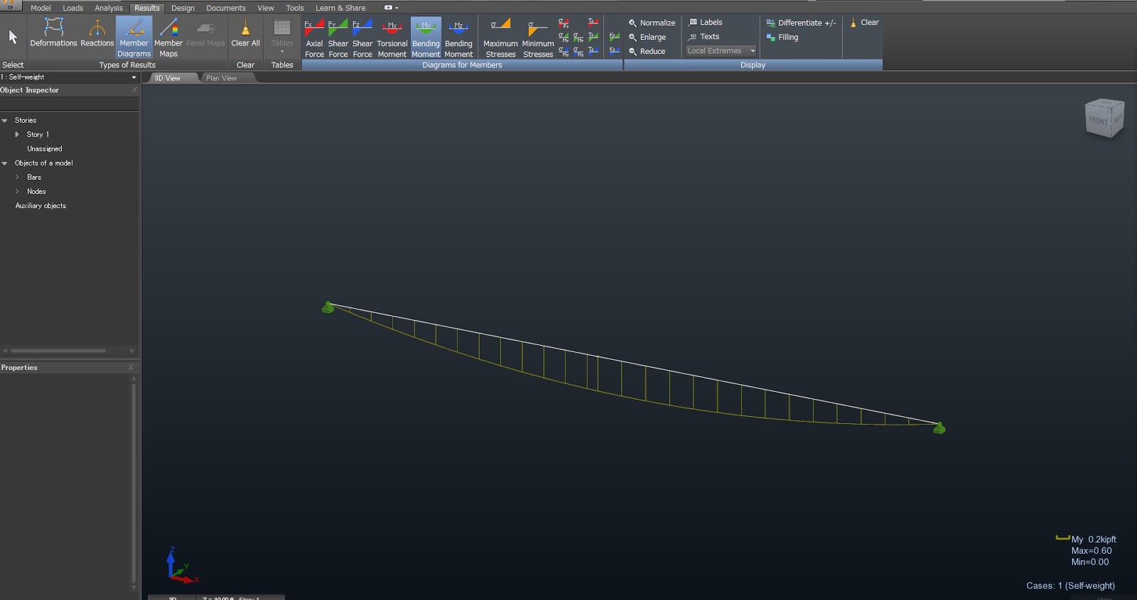 Dyanamo で解析は実行してあるので、こちらで解析実行ボタンのようなものを押す必要はありません。上のリボンの中にある Results タブを選択することで解析結果をみることができます。曲げモーメントを出力する場合は、Result タブの中の BeamDiagrams を選択し、BendingMoment を選択することで、解析結果が出力されます。