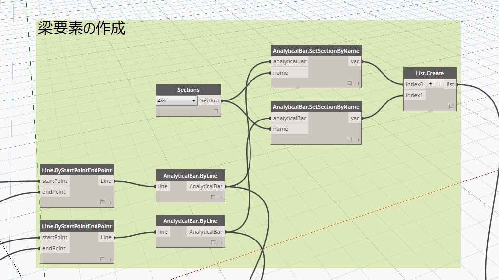 作成したラインは AnalyticalBar.ByLine につなげることで、解析用の梁要素を作成します。karamba でいうところの Line to Beam コンポーネントに該当する部分です。