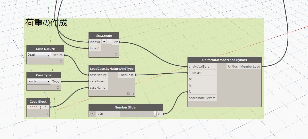 次に荷重を作成します。今回は梁に対して等分布荷重を与えることとします。等分布荷重は UniformMemberLoad.ByBar を使用します。analyticalBars には先程作成した梁要素を入れます。ここでは、二つの要素をまとめて扱うために一度 List ノードでひとまとめにしてから入力しています。