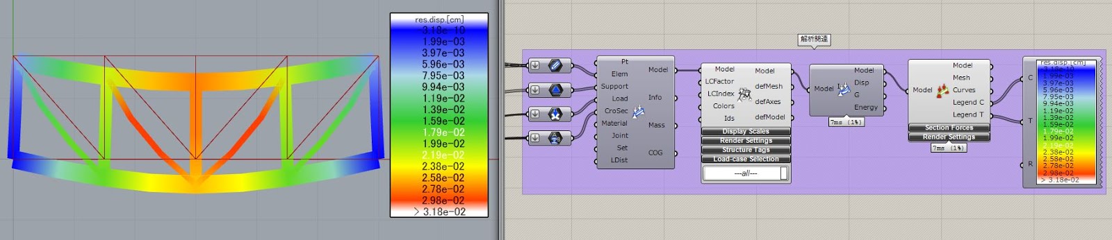 ModelVeiw コンポーネントに入力することで、モデルの断面の名前や、解析結果でのモデルの変形の図示の倍率などが設定できます。 このコンポーネントで、荷重で設定した LoadCase のどれを図示するかを設定するので、解析結果をみるときは今図示しているものの荷重ケースが何に該当するか気をつけましょう。