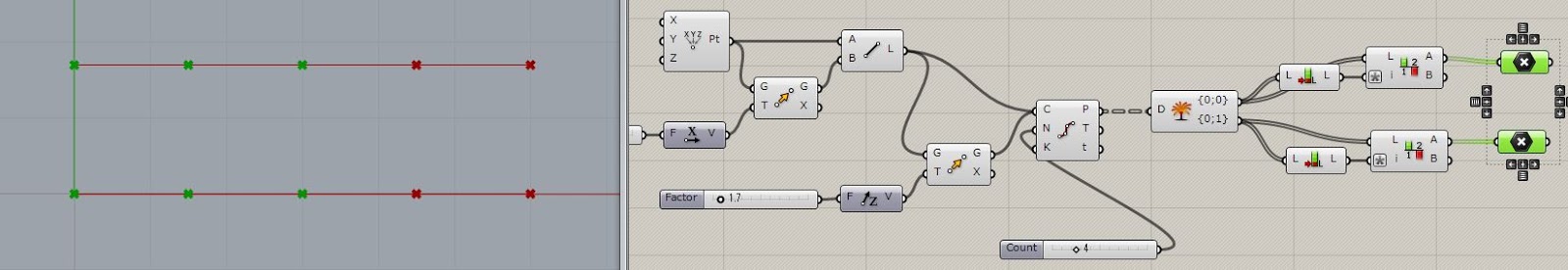 以上を Line コンポーネントにつなげることで、左側半分の斜材を作成できます。 同様にして右側半分も作成します。鉛直にまっすぐな部材は ExplodeTree コンポーネントからでてくるポイントをそのまま Line コンポーネントにつなげることで作成します。
