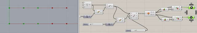 まず、斜材が取り付く位置にポイントを作成します。 Divide Curve コンポーネントを使用します。 入力する分割数は、トラス中央にまっすぐな部材を設置したいので、偶数(Even)を選択しています。