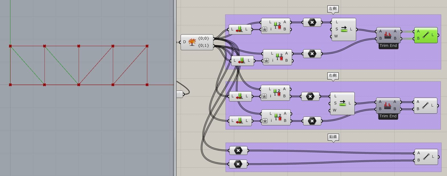 後の工程で上弦材と下弦材には、弦材としてひとまとめに断面を与える関係で Flatten を使用して RemoveDuplicateLines コンポーネントに入力しています。