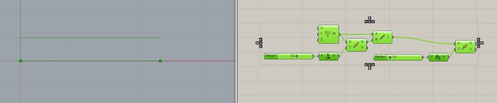 はじめにトラスの上弦材、下弦材を作成します。 Construction Point コンポーネントでポイントを作成し、それを Move コンポーネントで X 方向に移動させます。この 2 点を Line コンポーネントに入力することで、まずは下弦材を作成します。 ポイントを移動させたことと同様に、Move コンポーネントで下弦材を Z 方向に移動させることで上弦材を作成します。