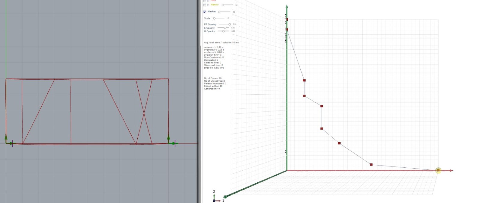 一方で、部材数は同じなので、自重はほとんど変化しないことはもともと分かっているので、ここでわざわざ多目的最適化する必要がなかったのでは?という点がありますが、今回は使用法ということで、パラメータの設定に失敗していることはあまり気にしないでください。すみません。