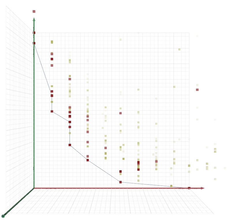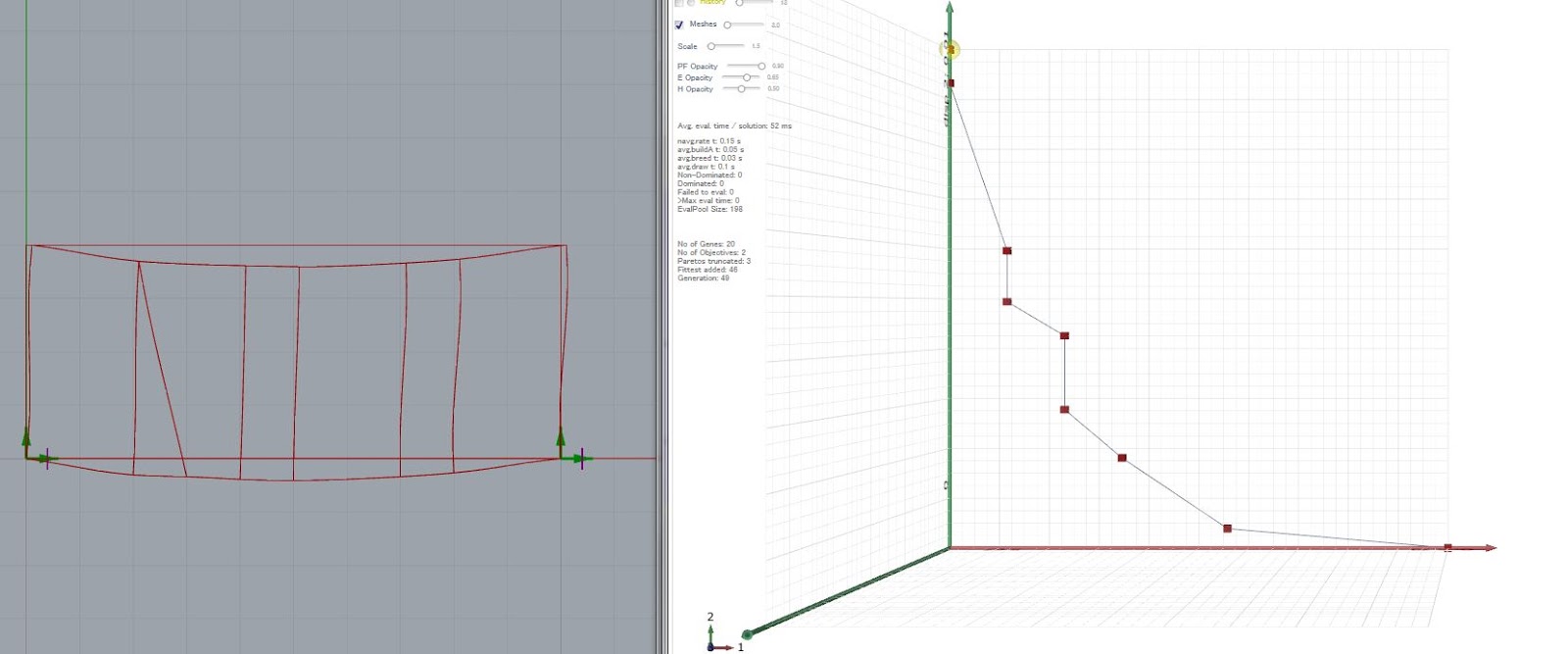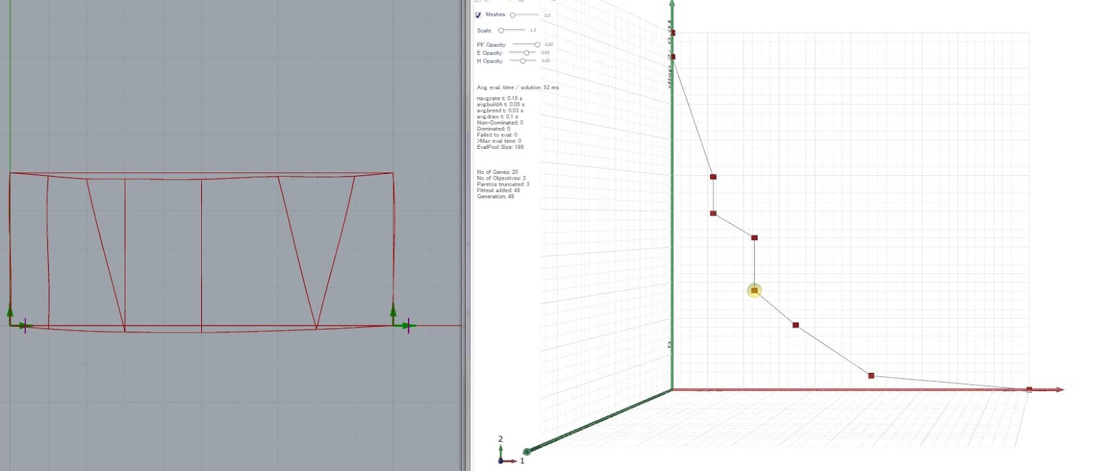 Octopus は Grasshopper の標準で搭載されている Galapagos ツールとの違いは、galapagos は単一の目的値の最小化・最大化問題を遺伝的アルゴリズムで解くのに対して、 Octopus は多目的遺伝的アルゴリズムのプラグインであるため、複数の目的値の最適化を同時に行うことができます。 またそれを可視化して、パレート解を確認することができます。