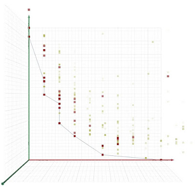 パレート解とは、多目的を最適化しているため、「A を最適にすると B はいまいち、B を最適化すると A はいまいち、A、B の二つがそこそこよい値」などアルゴリズムだけでは甲乙つけがたい複数の最適解が生まれます。 その解の集まりをパレート解群と言います。 多目的遺伝的アルゴリズムは、現状の最適化で非常に多く使われているので、検索すれば多くの手法、理論がでてくると思いますので、説明はこの程度にしておきます。