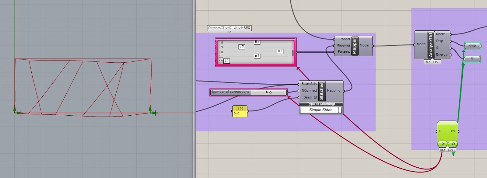 目的値は、トラスの構造性能の最大化と部材量の最小化を目的として、karamba の AnalyzeTh1 での Disp(最大変位)と G(自重)の二つの値を目的値として設定しています。パラメータは上弦材と下弦材を接続する部材の接続箇所(0.001 ~ 0.999 まで 0.001 刻み)としています。(※ここで接続箇所とは、部材全長を 1 としたときの相対的な位置)